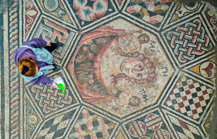 Mozaikte kullanılan teknik ve detaylara dikkat çeken Kahveci, “Her bir rengin 3-4 farklı tonuyla oluşturulmuş saç örgüsü motifleri, labirent ve Gordion düğümü gibi detaylar mozaiğin ustaca işlendiğini gösteriyor” dedi. Kullanılan tessera adı verilen yapı taşlarının taş, mermer ve camdan elde edildiği, merkezdeki figürlerde yarım santimetreküpe kadar indirilen küçük parçalarla çalışıldığı kaydedildi.