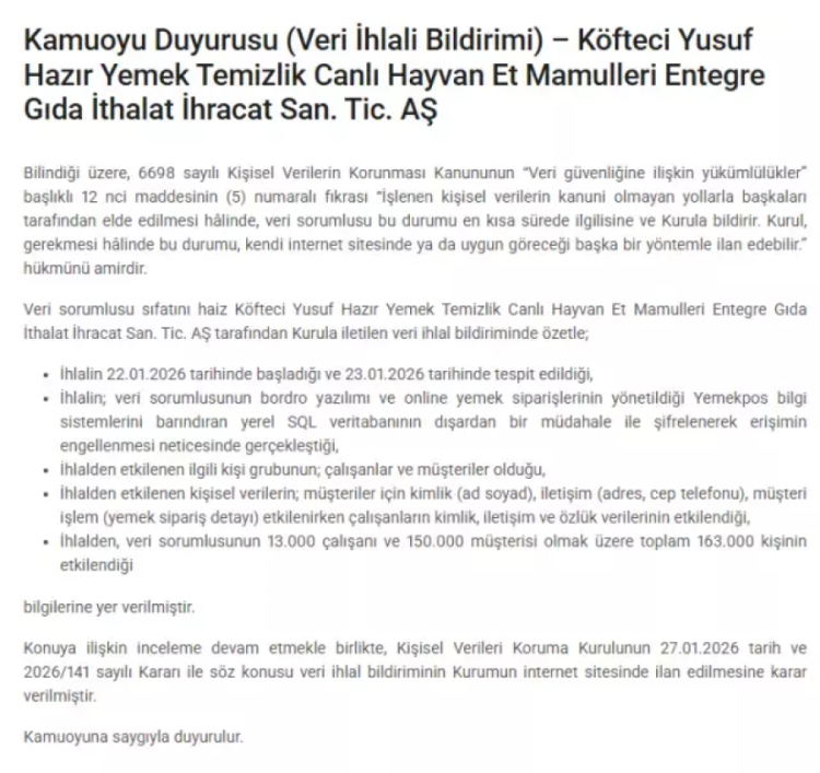 Kişisel Verileri Koruma Kurumu (KVKK), Köfteci Yusuf’un bilgi sistemlerine yönelik siber saldırı sonucu 13 bin çalışan ve 150 bin müşteriye ait kişisel verilerin ihlal edildiğini duyurdu. İnceleme süreci devam ediyor.