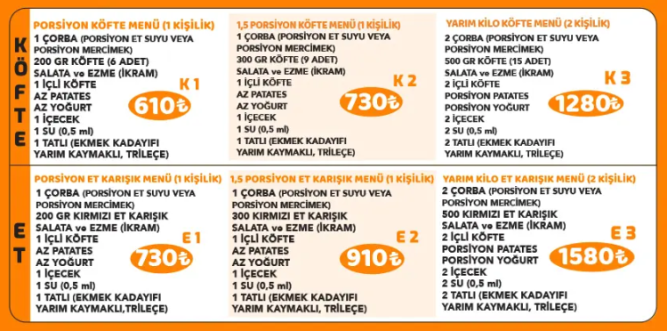 1,5 porsiyon köfte, döner veya et karışık menü (1 kişilik) : 730 TL