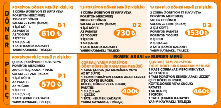 Yarım kilo döner menü (2 kişilik): 1530 TL