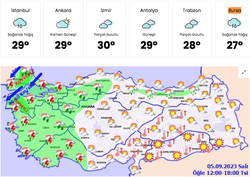 Meteoroloji'den yapılan son hava durumu tahminlerine göre bugün (5 Eylül Salı) bazı illerde sağanak yağış bekleniyor. Yetkililerden ise olumsuz hava koşullarına karşı vatandaşlara tedbirli ve dikkatli olunması uyarısı yapıldı.