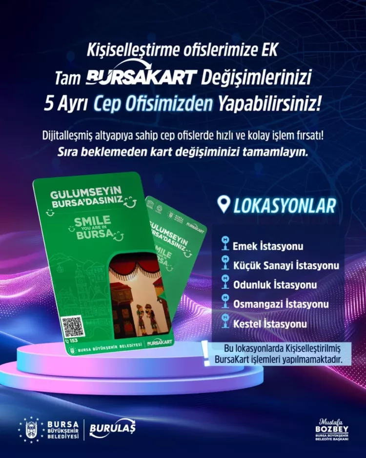 Odunluk, Emek, Küçük Sanayi, Kestel ve Osmangazi bölgelerinde kurulacak cep ofislerde ise sadece Tam Anonim Kart değişimi yapılacak.