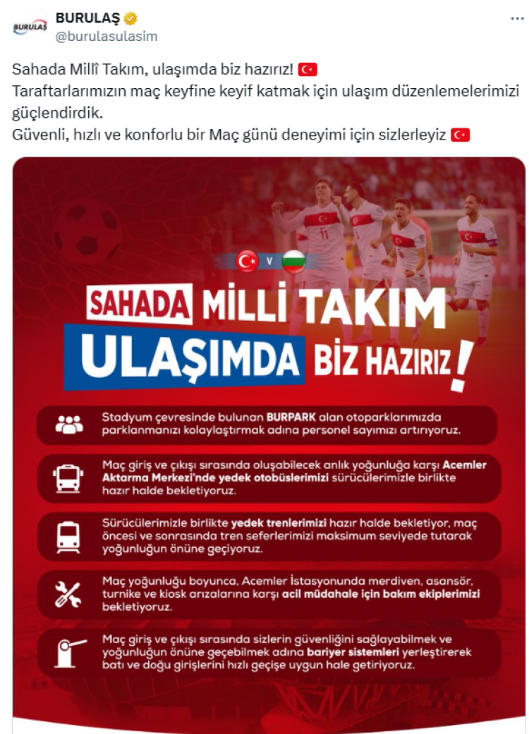 Yapılan açıklamada, “Sahada Millî Takım, ulaşımda biz hazırız” ifadesi kullanılarak, taraftarlara güvenli, hızlı ve konforlu bir yolculuk sunmak amacıyla tüm ekiplerin görev başında olacağı vurgulandı.