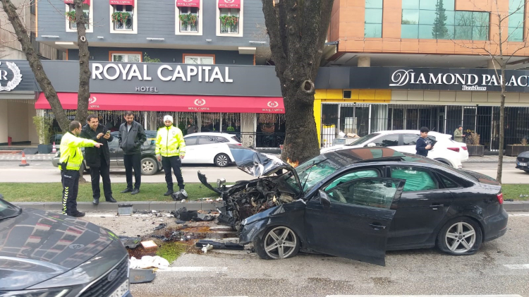 Bursa'nın Osmangazi ilçesi Çekirge Caddesi'nde meydana gelen kazada, direksiyon hakimiyetini kaybeden bir kadın sürücü, ağaca çarptı.