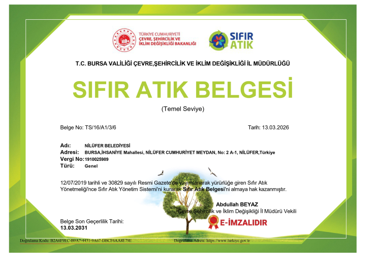 Nilüfer Belediyesi, 12 Temmuz 2019 tarihli Sıfır Atık Yönetmeliği çerçevesinde kurduğu sistemle Bursa Valiliği Çevre, Şehircilik ve İklim Değişikliği İl Müdürlüğü tarafından verilen Temel Seviye Sıfır Atık Belgesi’ni yenileyerek 13 Mart 2031 tarihine kadar geçerli hale getirdi.