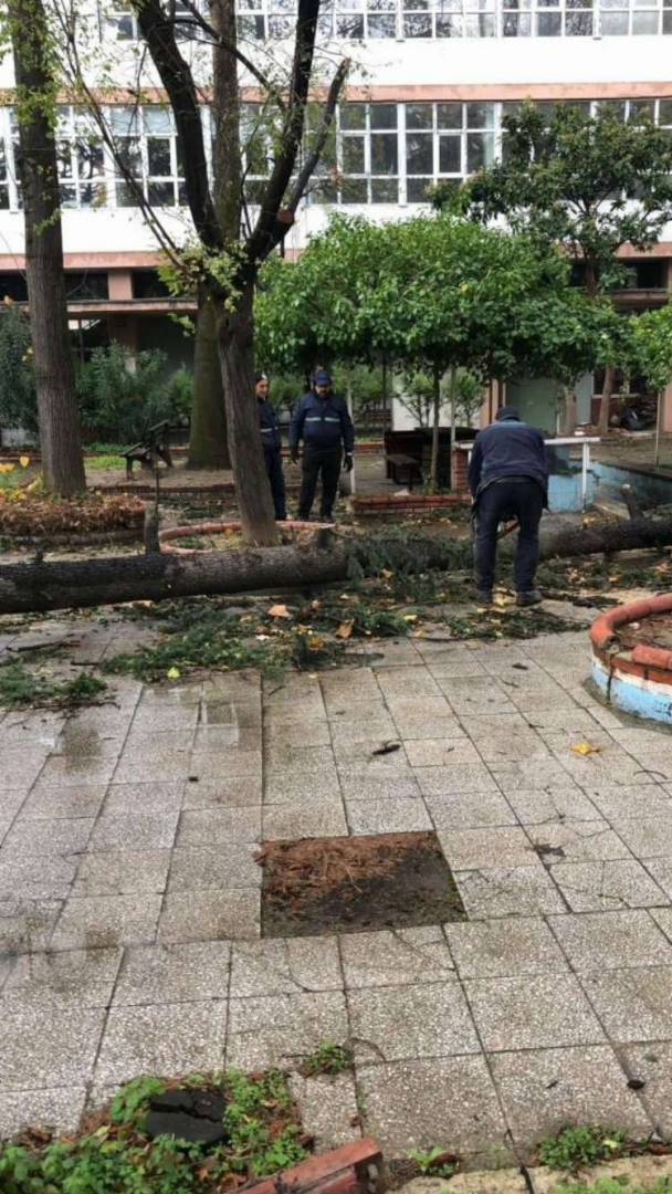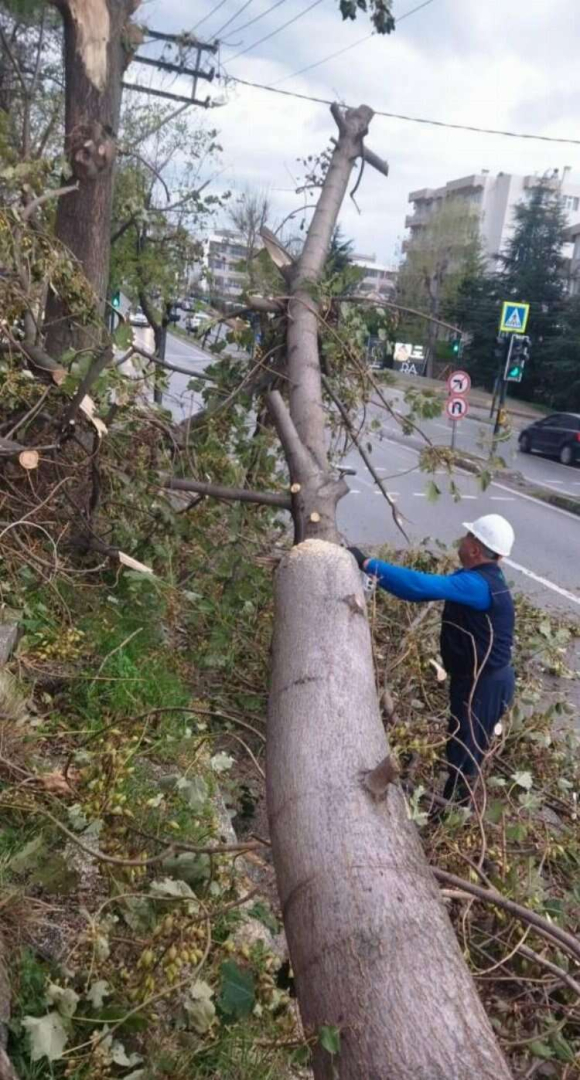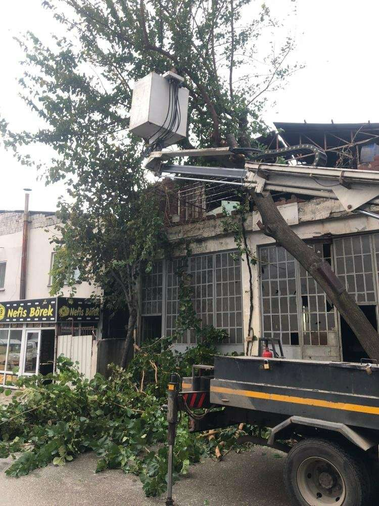 Osmangazi Belediyesi ekipleri, gün boyunca 21 mahallede 130, 12 okulda 52 ağacı devrildikleri yerden kaldırarak günlük hayata uygun hale getirdi.