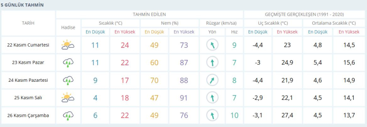 22 Kasım Cumartesi – Parçalı Bulutlu: Sıcaklık 11°C – 24°C aralığında. Nem %49–73. Rüzgâr 9 km/sa. Geçmiş yıllara göre bu tarihin en yüksek sıcaklığı 23°C, en düşük -4,4°C idi.