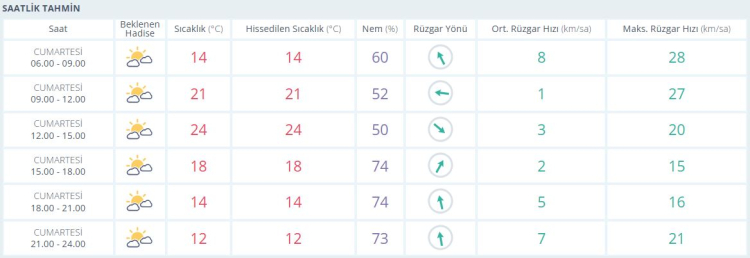 06.00 – 09.00: Güne 14°C sıcaklıkla başlanacak. Parçalı bulutlu hava hâkim olurken hissedilen sıcaklık aynı seviyede olacak. Nem %60 civarında, rüzgârın maksimum hızı ise 28 km/sa.