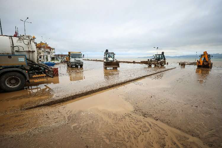 Bursa Büyükşehir Belediyesi Bursa Su ve Kanalizasyon İdaresi (BUSKİ), Mudanya Belediyesi ile diğer kurumlara bağlı ekipler, yağışın yol açtığı olumsuzlukları gidermek için iş makineleriyle çalışmalarını sürdürüyor.