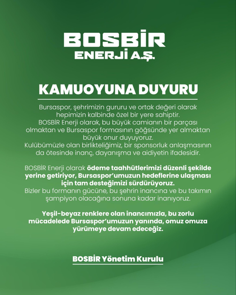 “Bursaspor, bu şehrin yıllardır ortaya koyduğu emek, inanç ve birlik ruhuyla yeniden ayağa kalkmıştır. Bursa’nın tüm kurumları, sanayi kuruluşları ve iş dünyası Bursaspor’a her zaman destek olmuş, olmaya da devam etmektedir. BOSBİR A.Ş.’nin kamuoyuna yaptığı açıklamada da belirtildiği üzere, sponsorluk kapsamındaki taahhütler planlandığı şekilde ve eksiksiz olarak yerine getirilmektedir. Hiçbir aksama söz konusu değildir.”