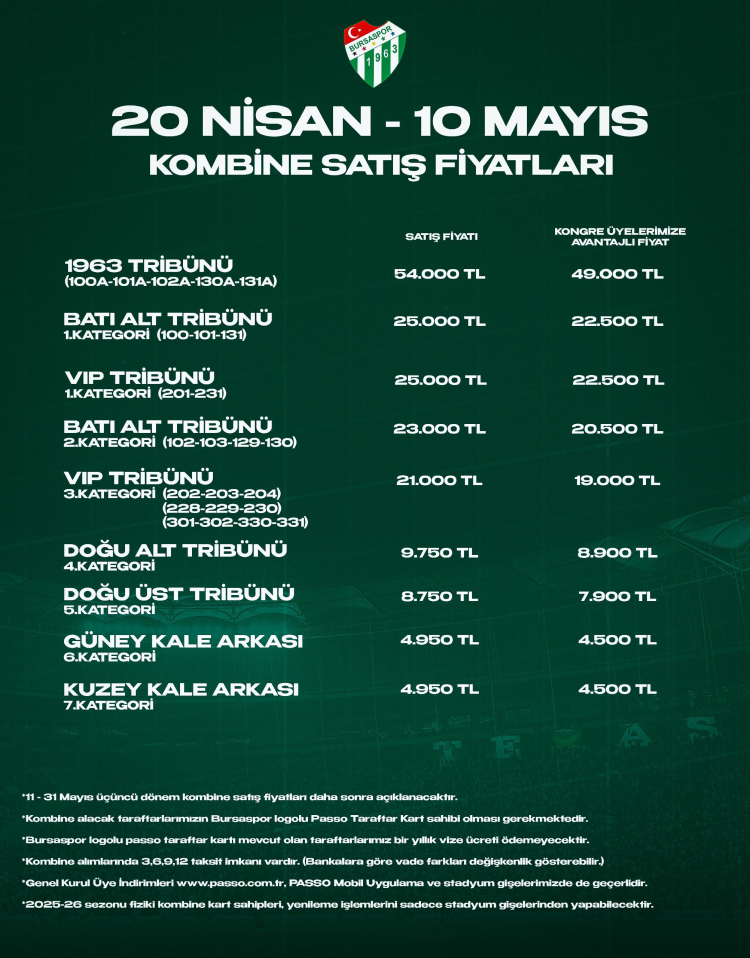 Bursaspor Kulübü, stadyumun her noktasını doldurmak ve taraftarıyla bütünleşmek adına yeni kombine bilet fiyatlarını resmen duyurdu. 20 Nisan – 10 Mayıs tarihleri arasını kapsayan dönemde, hem genel taraftarlar hem de kongre üyeleri için farklı avantajlar sunuluyor.