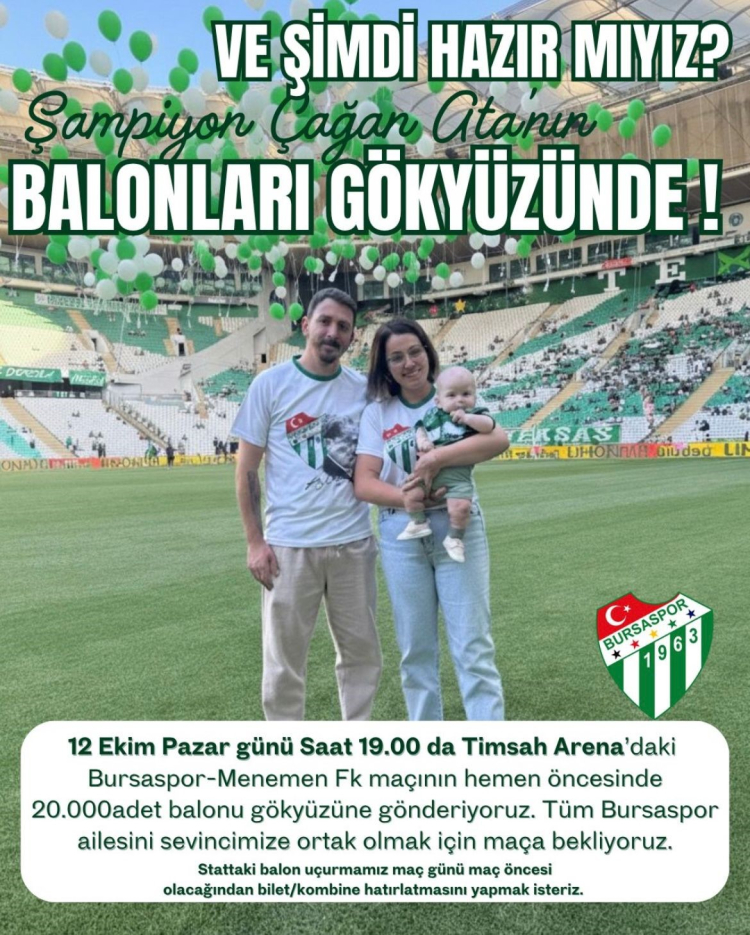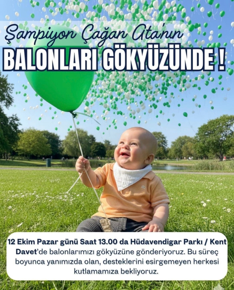 Bursa’da SMA Tip-1 hastası 6 aylık minik Çağan Ata için mutlu sona ulaşılması, Bursaspor taraftarları tarafından büyük bir coşkuyla kutlanacak. Pazar akşamı Atatürk Spor Kompleksi Matlı Stadyumu’nda düzenlenecek etkinlikte, 20 bin yeşil-beyaz balon gökyüzüne salınacak.
