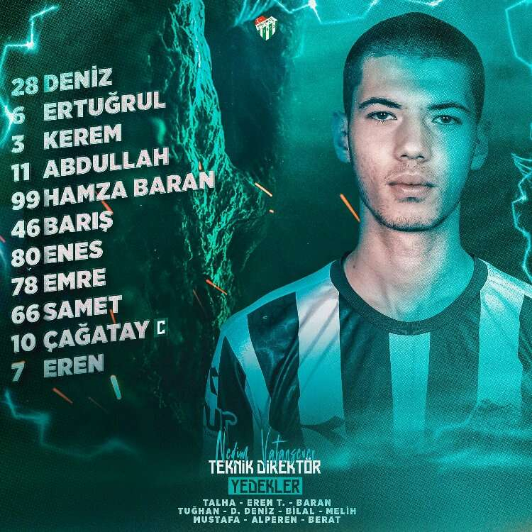 Bursaspor: Deniz Aydın, Hamza Baran Arıkan (Mustafa Genç dk. 41), Ertuğrul Kurtuluş (Baran Karagöz dk. 71), Kerem Kök, Abdullah Tazgel, Barış Dalkıran, Samet Bozkurt, Enes Gökhan (Berat Altındiş dk. 41), Emre Tepegöz (Bilal Güney dk. 40), Çağatay Yılmaz, Eren Güler (Alperen Şirin dk. 58)