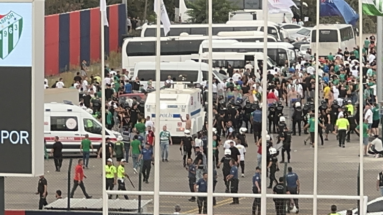 Bu durum üzerine, polis ekipleri biber gazı ve tazyikli su kullanarak müdahale etti. İHA’nın haberine göre Bursaspor taraftarlarının polis ekiplerine taş ve yabancı maddeler attığı belirtildi.