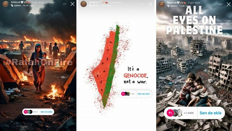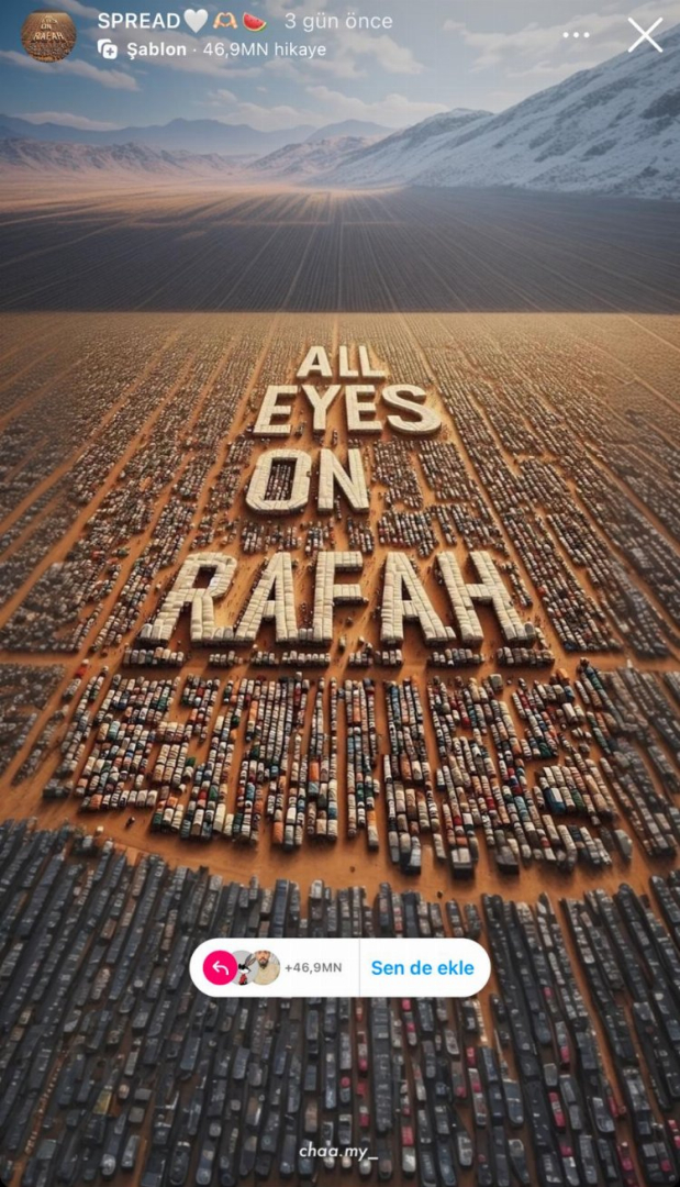 "Tüm gözler Refah'ta" anlamına gelen "All Eyes on Rafah" sloganının yer aldığı bir tasarım, 48 saatte 45 milyondan fazla paylaşım aldı.