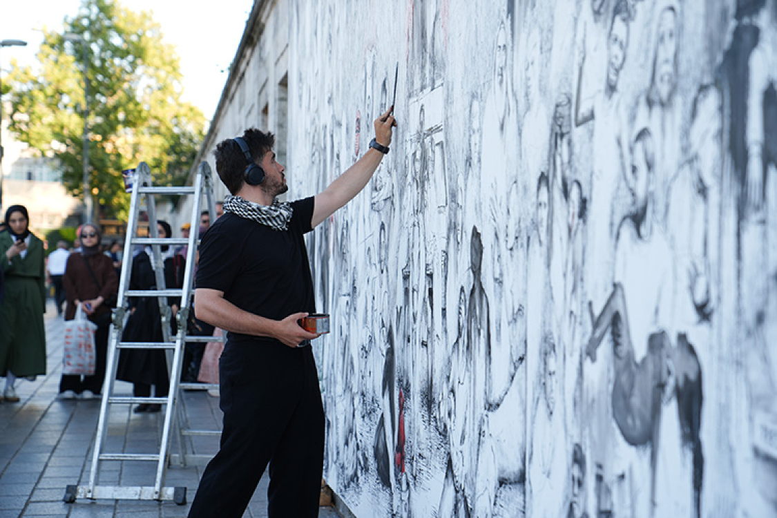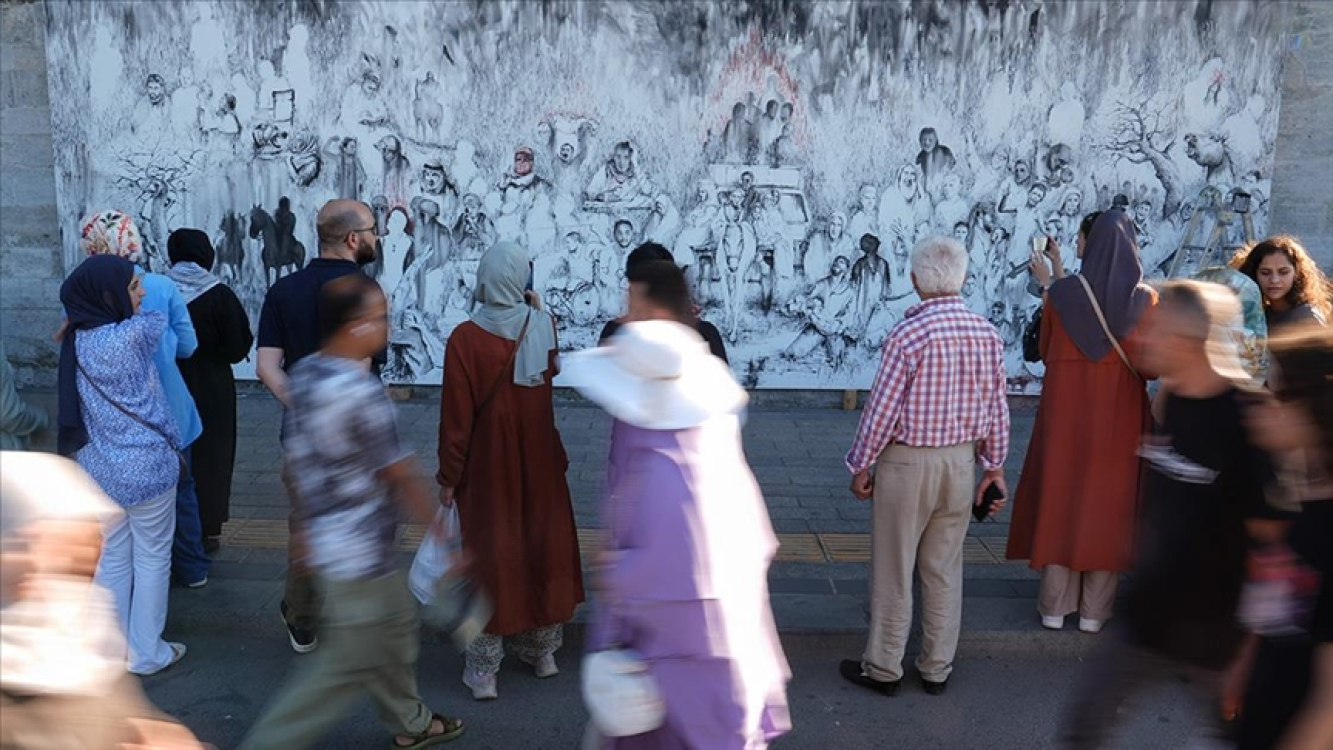 Filistin'de yaşanan acı olayların resmedildiği tablonun son çizgilerine şahit olmak isteyen İstanbullular da oturma eylemiyle projeye destek vererek, İsrail'in aylardır devam eden zulmüne tepki gösterdi.