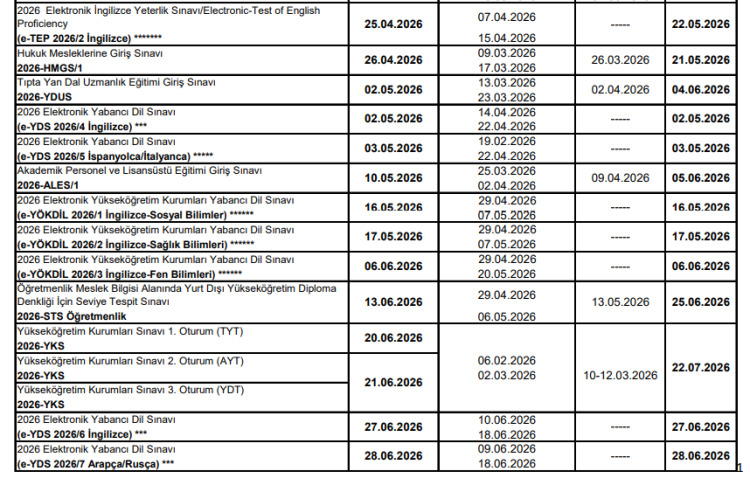 Buna göre YKS 20-21 Haziran’da, DGS 19 Temmuz’da ve MSÜ sınavı 1 Mart’ta gerçekleştirilecek.