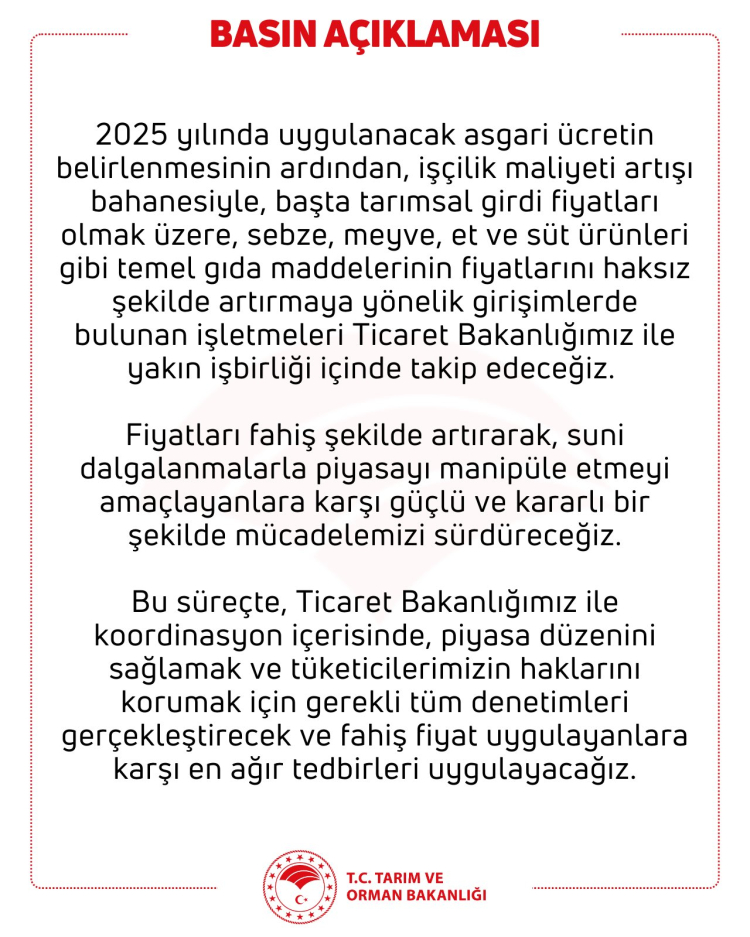 Fiyat artışlarının suni dalgalanmalara yol açmaması için güçlü ve kararlı bir mücadele sürdüreceklerini belirten Tarım ve Orman Bakanlığı, bu süreçte piyasayı düzenlemek ve tüketici haklarını korumak için gerekli tüm denetimlerin yapılacağını ifade etti.