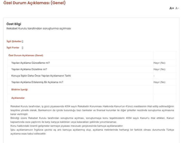 Soruşturmanın gündeme gelmesinin ardından, Yapı Kredi, konuya ilişkin olarak Kamuyu Aydınlatma Platformu’na (KAP) açıklama yaptı. Banka açıklamasında, Rekabet Kurulu’nun 4054 sayılı Rekabetin Korunması Hakkında Kanun’un 4’üncü maddesinin ihlal edilip edilmediğini tespit etmek amacıyla soruşturma başlattığını belirtti.