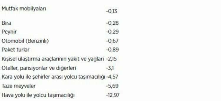 Fiyatı düşüş gösteren diğer ürünler yüzde 2,15 ile kişisel ulaştırma araçlarının yakıt ve yağları, yüzde 0,89 ile paket turlar, yüzde 0,67 ile benzinli otomobil, 0,29 ile peynir, yüzde 0,28 ile bira, yüzde 0,13 ile mutfak mobilyaları oldu.