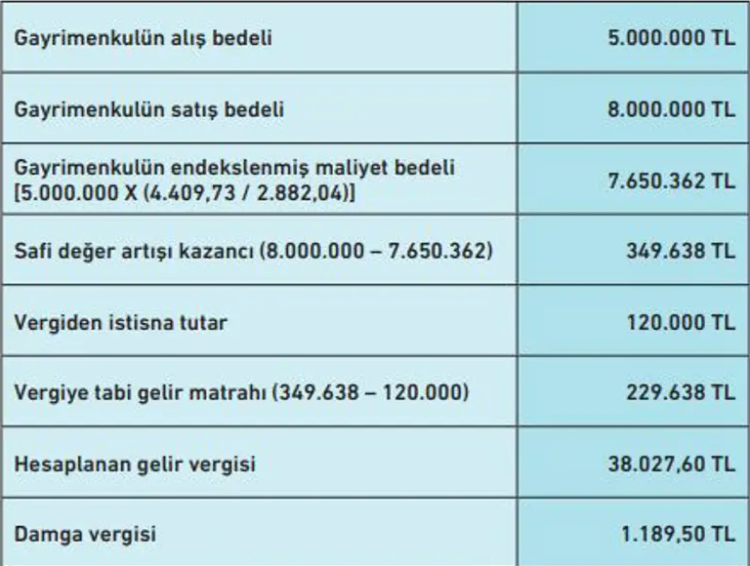 Bu durumda 5 milyon TL’lik maliyet, yaklaşık 7 milyon 650 bin TL’ye yükseltiliyor. Vergi, satış bedeli ile endekslenmiş maliyet arasındaki fark üzerinden hesaplanıyor.