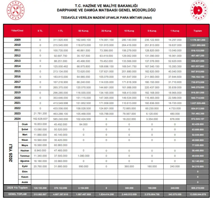 2009’da Yeni Türk Lirası (YTL) uygulamasının kaldırılmasının ardından TL olarak basılan tüm madeni paralar hesaplandığında, 13 milyar 588 milyon 944 bin 976 liralık madeni para hâlen tedavülde bulunuyor.