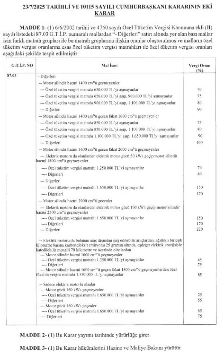 Resmi Gazete’de yayımlanarak yürürlüğe giren yeni düzenlemeyle birlikte, otomobil ve pick-up araçlara uygulanan Özel Tüketim Vergisi (ÖTV) oranları ve matrah dilimleri köklü biçimde değiştirildi. Yeni sistemde, motor hacmine, yakıt tipine ve matrah değerine göre belirlenen oranlar araç fiyatlarını doğrudan etkiledi.