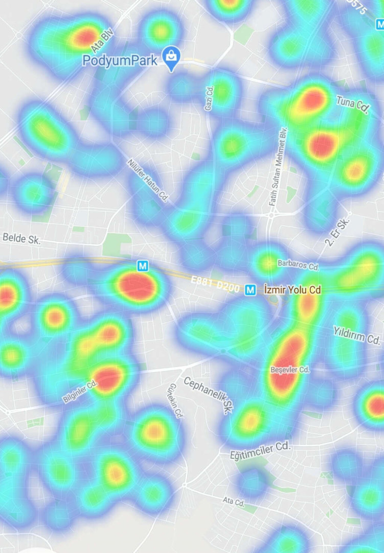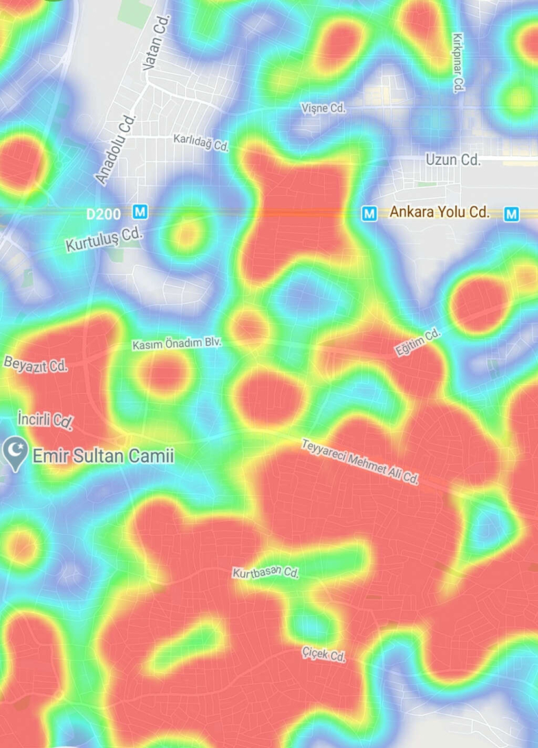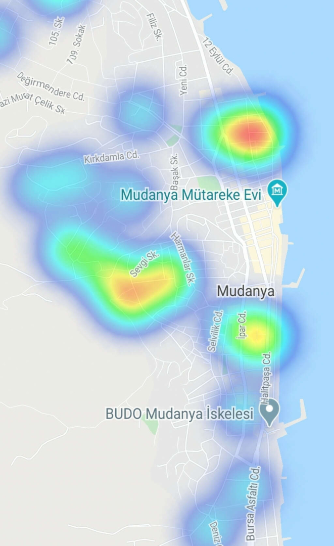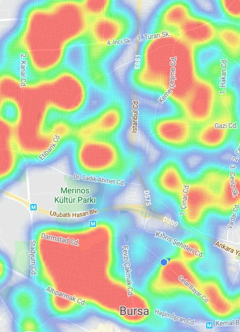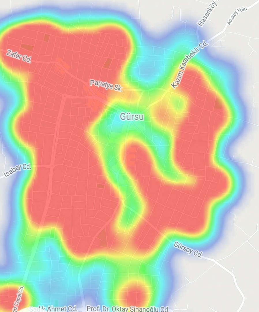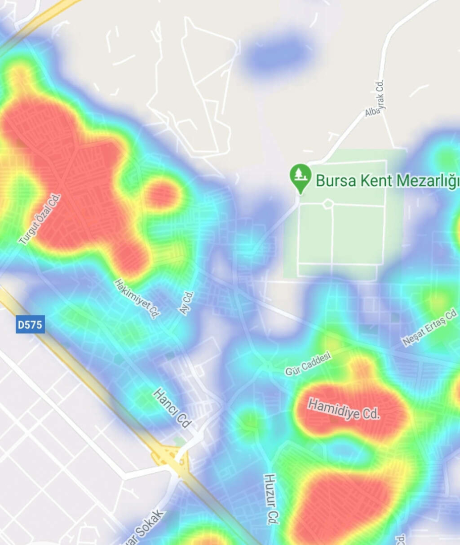 Sağlık Bakanlığı'nın Türkiye genelindeki riskli bölgeleri gösteren Hayat Eve Sığar uygulamasında Bursa'nın bazı ilçelerinde kırmızı renkler çoğalmış durumda. Uygulamada kırmızı renkler, yüksek riskli bölgeyi, yeşil halka az riskli bölgeyi, sarı halka ise orta riskli bölgeyi gösteriyor.