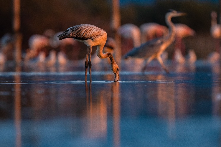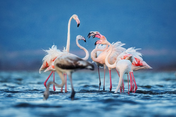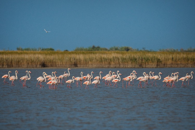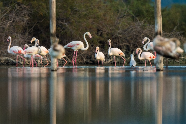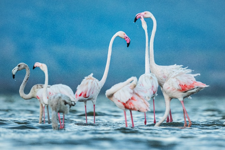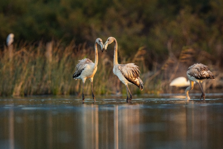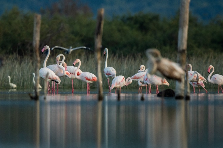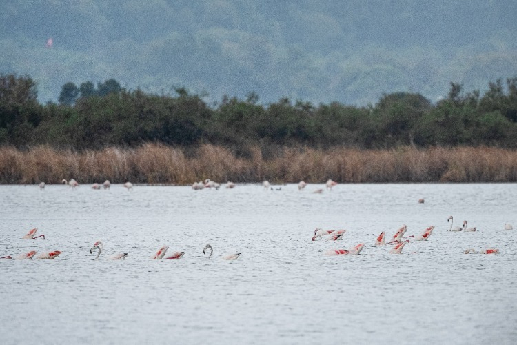 Pembe tüyleri ve uzun boyunlarıyla dikkat çeken bu zarif kuşlar, gruplar halinde beslenerek muhteşem bir görüntü sergiliyor.