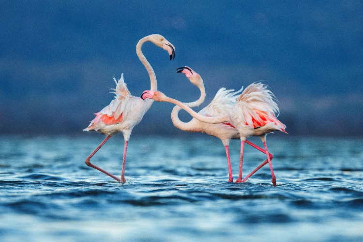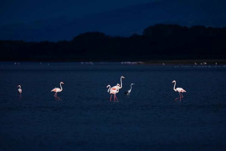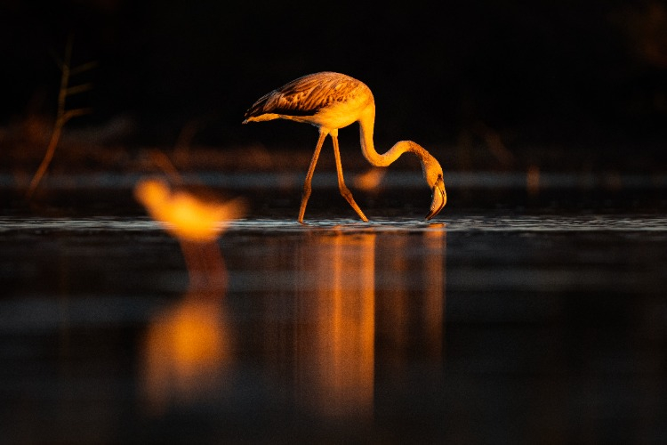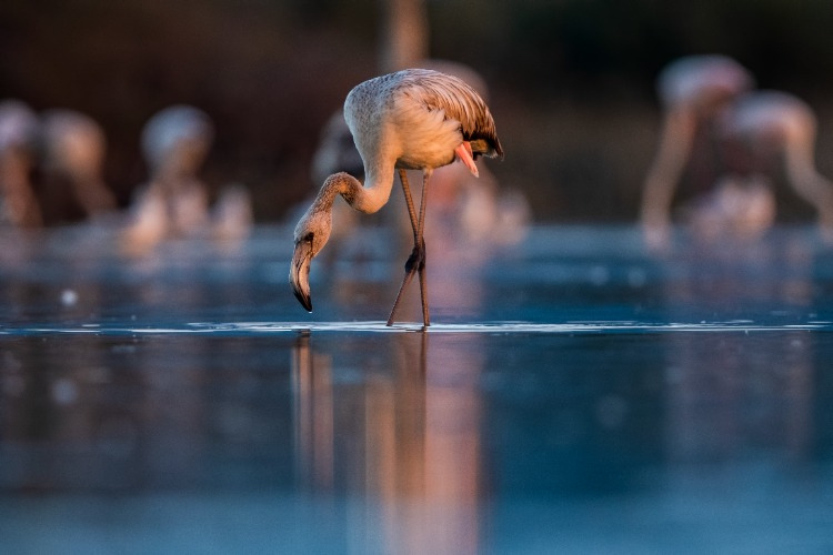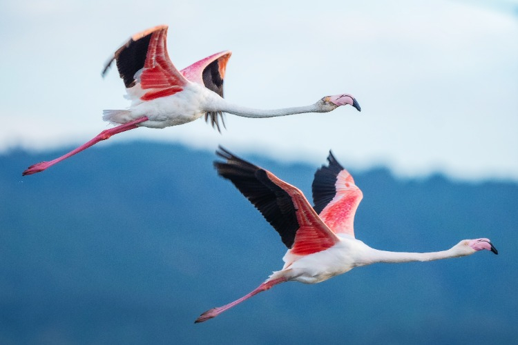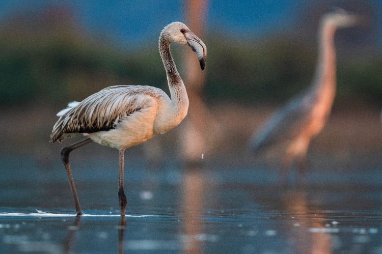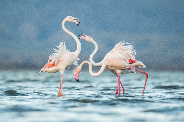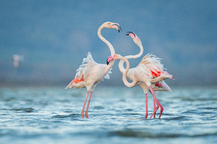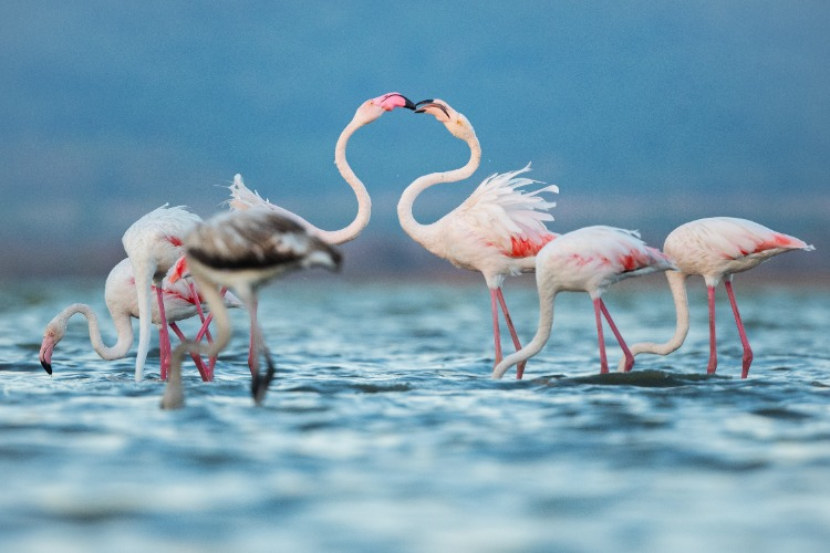 Pembe tüyleri ve uzun boyunlarıyla dikkat çeken bu zarif kuşlar, gruplar halinde beslenerek muhteşem bir görüntü sergiliyor.