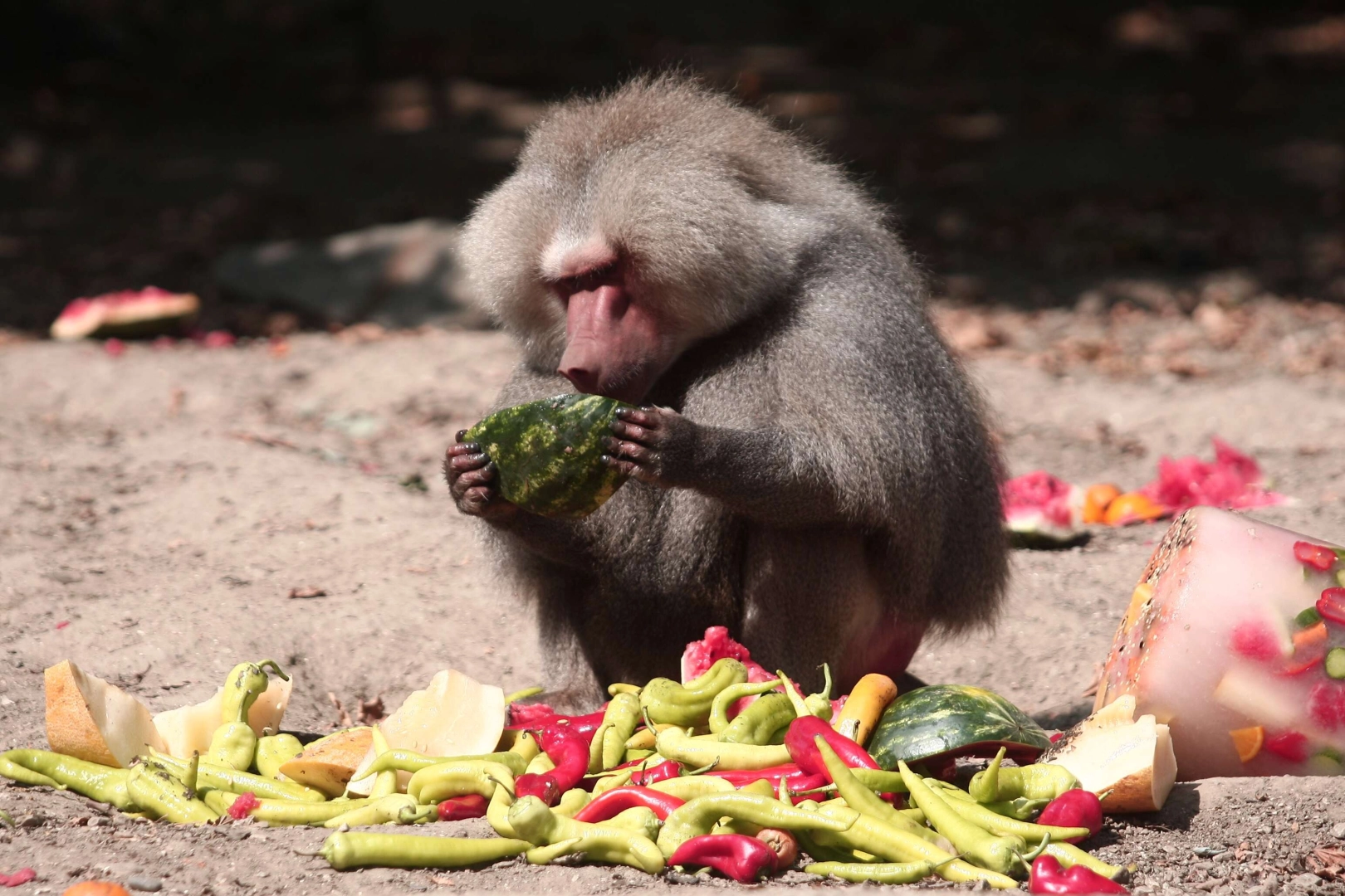 Bursa Büyükşehir Belediyesi Hayvanat Bahçesi’nde hayvanlar Afrika sıcaklarında buzlu meyve ve sebzelerle serinliyor.