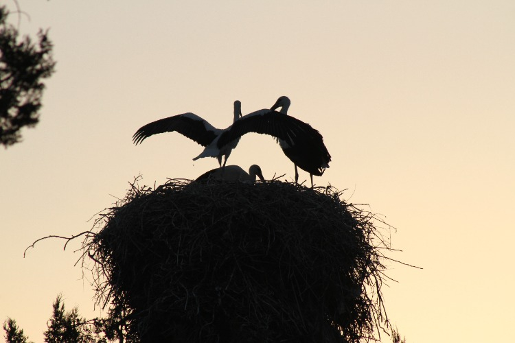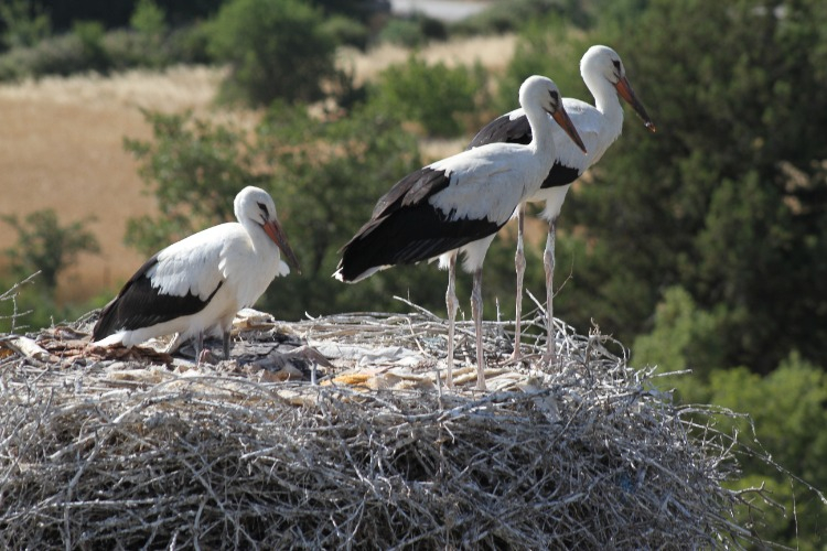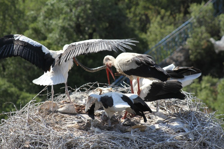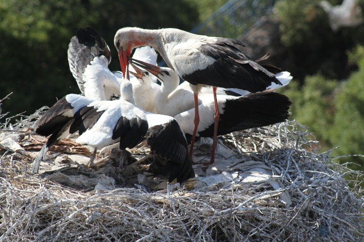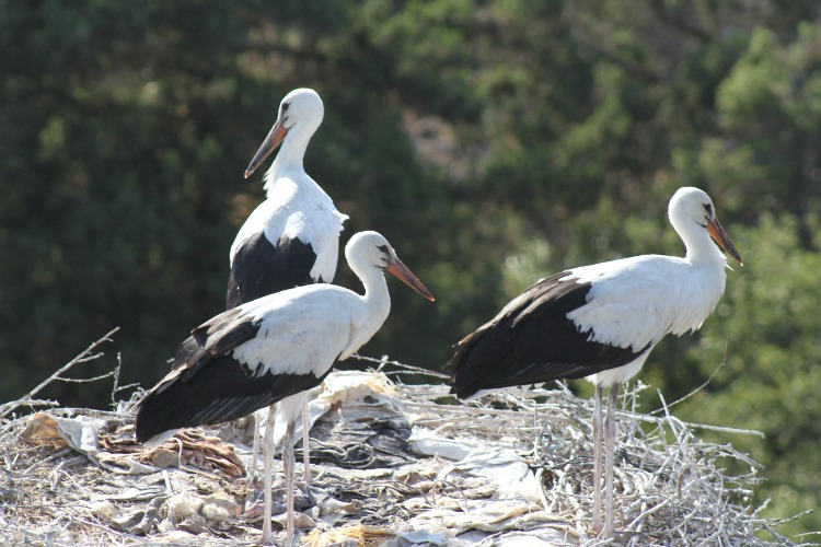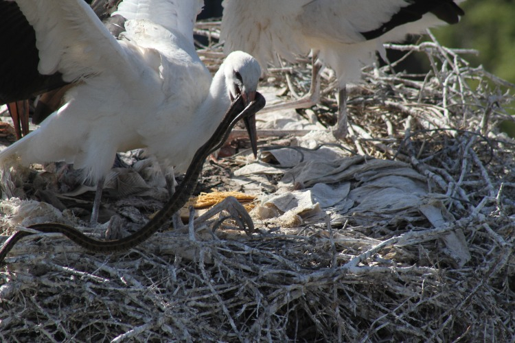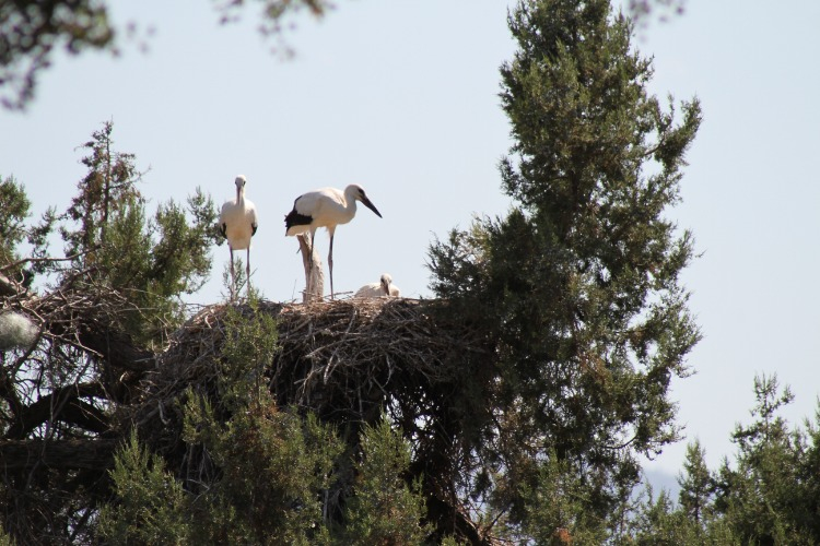 Ebeveynlerinin ardıç ağaçlarındaki yuvalarına taşıdıkları yiyeceklerle beslenen leylek yavruları, ziyafet anlarına tanıklık edenler için renkli görüntüler oluşturuyor.