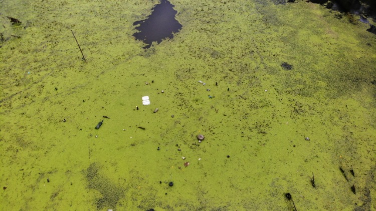 Nehrin yüzeyi tamamen yeşile dönerken, çöpler ise gün yüzüne çıktı.