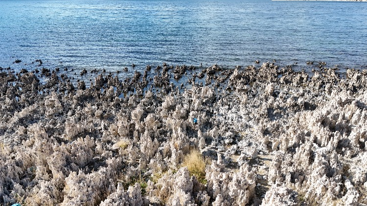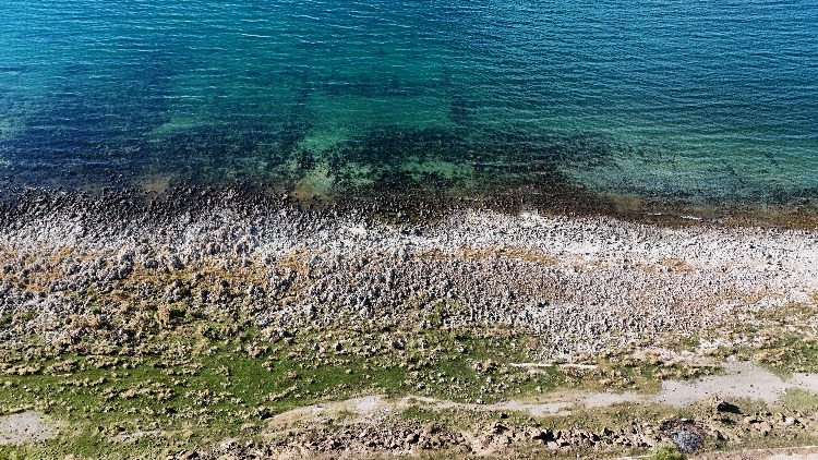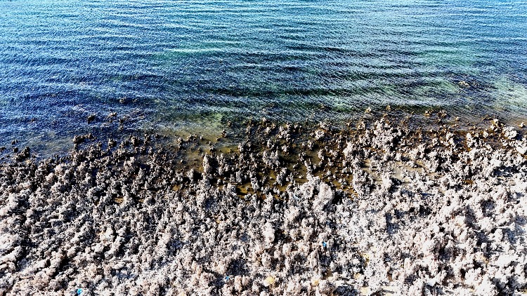 Van Gölü'nün çekilmesiyle birlikte, kıyıları kaplayan mikrobiyalitler yaşanan çekilmeyi gözler önüne seriyor.