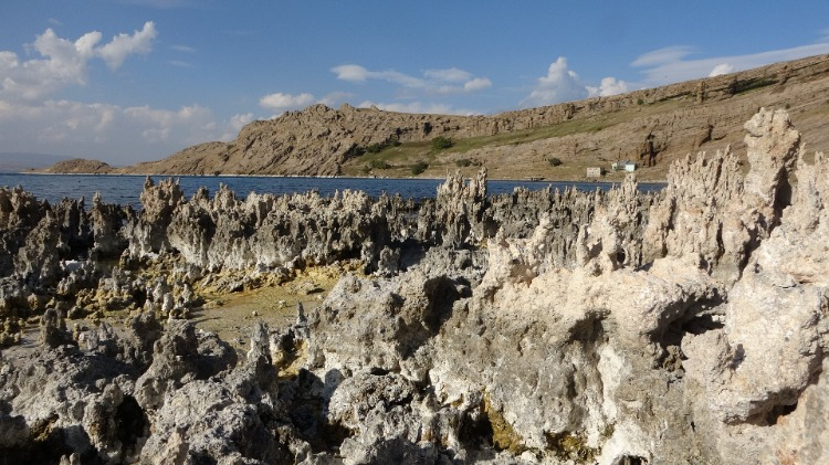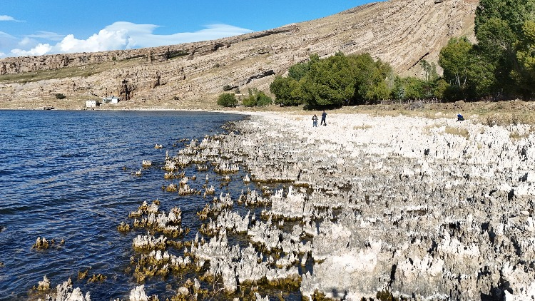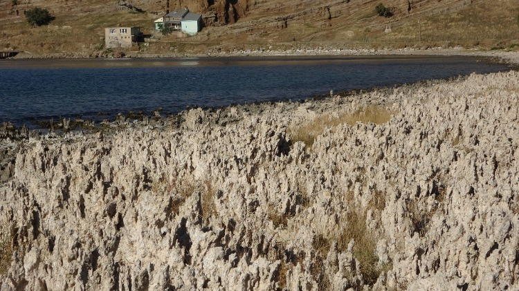 İklim değişikliğinin etkileriyle suları çekilen Van Gölü'nde mikrobiyalitler açığa çıktı.