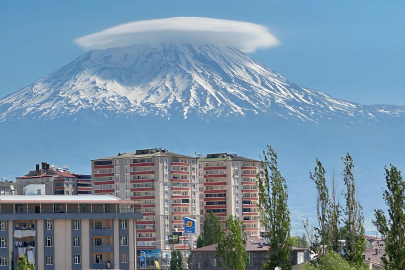Türkiye'nin en yüksek dağı Ağrı Dağı'nın zirvesinde oluşan mercek bulutu, kartpostallık görüntüler sundu. Şapka şeklindeki bulut, zirveyi kaplayarak hayranlık uyandırdı. Fotoğraf tutkunları manzarayı ölümsüzleştirmek için yarıştı.