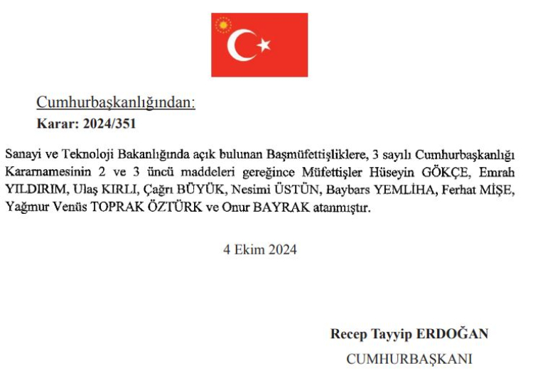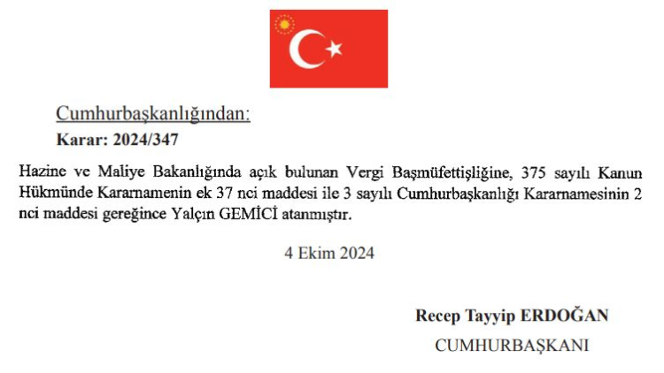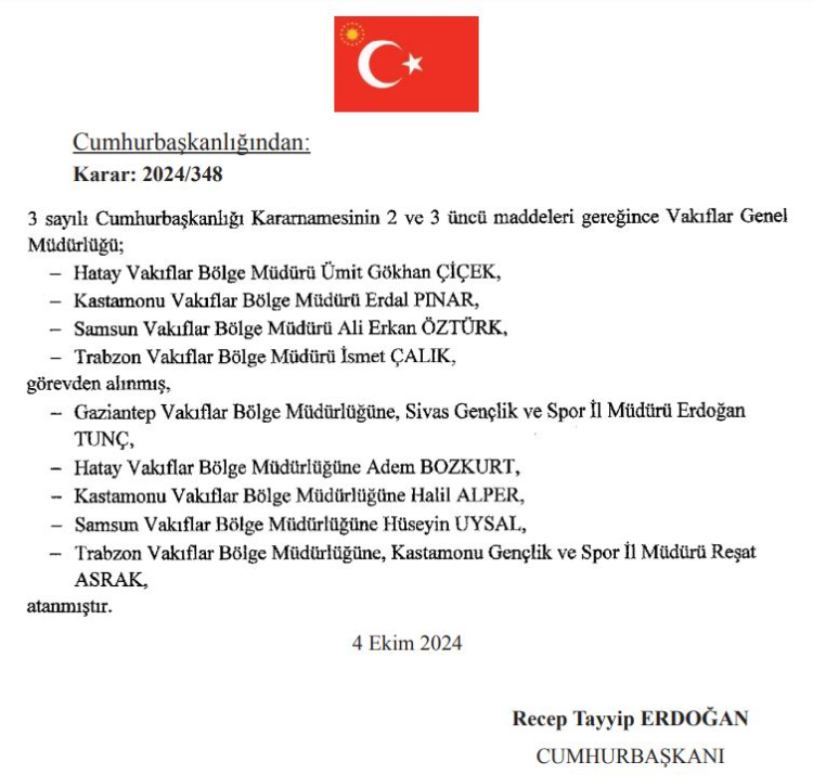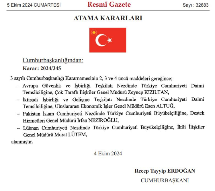 Cumhurbaşkanlığı tarafından yapılan atamalar hakkında kararlar 5 Ekim 2024 tarihli Resmi Gazete’de yayımlandı.