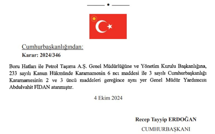 Boru Hatları ile Petrol Taşıma AŞ Genel Müdürlüğüne ve Yönetim Kurulu Başkanlığına Genel Müdür Yardımcısı Abdulvahit Fidan Atandı.