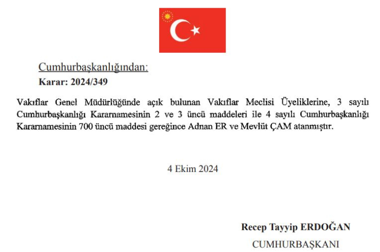 Vakıflar Genel Müdürlüğü'nde açık bulunan Vakıflar Meclisi Üyeliklerine Adnan Er ve Mevlüt Çam atandı.