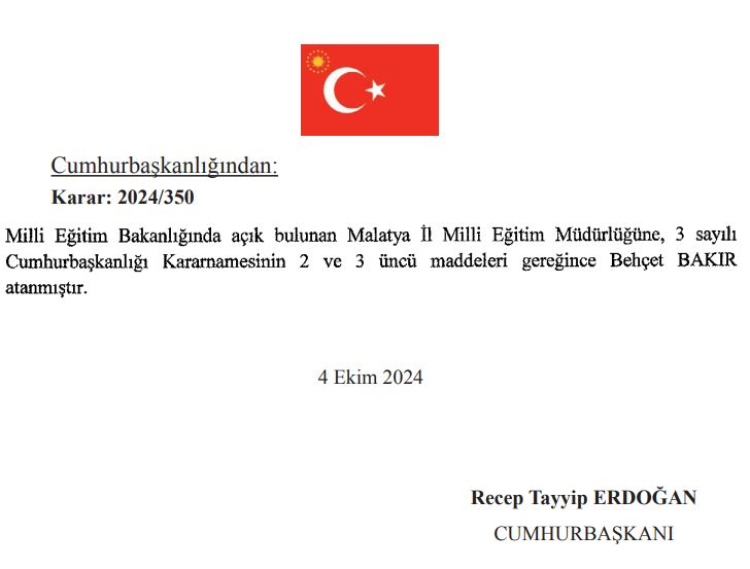 Milli Eğitim Bakanlığı'nda açık bulunan Malatya İl Milli Eğitim Müdürlüğü'ne Behçet Bakır atandı.