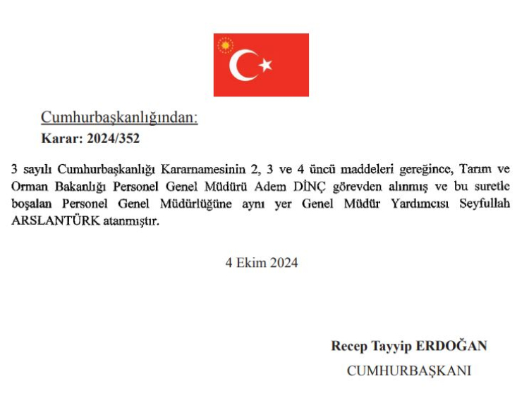 Tarım ve Orman Bakanlığı Personel Genel Müdürü Adem Dinç görevden alındı. Yerine Genel Müdür Yardımcısı Seyfullah Arslantürk atandı.