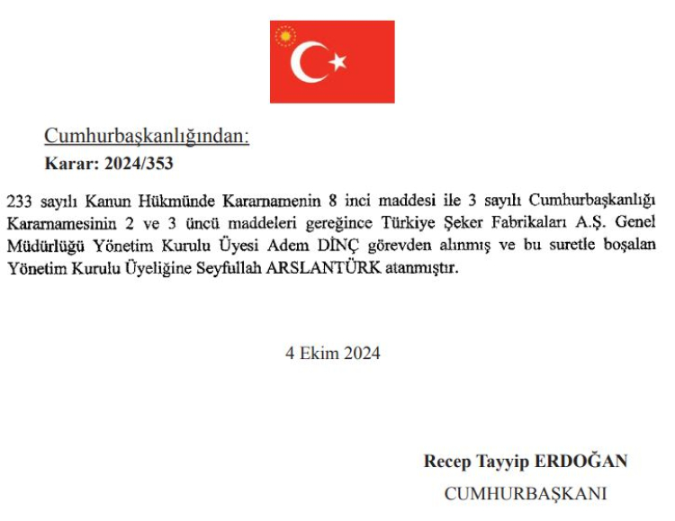 Türkiye Şeker Fabrikaları AŞ Genel Müdürlüğü Yönetim Kurulu Üyesi Adem Dinç görevden alındı, yerine Seyfullah Arslantürk atandı.