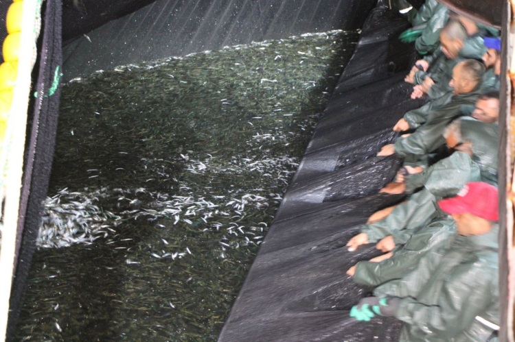 Teknenin 25 kişilik mürettebatı, balıkla dolan ağları yaklaşık 2 saatte topladı. Balıkçılar, sardalyaları tür ve büyüklüğüne göre ayırarak kasalara yerleştirdi.