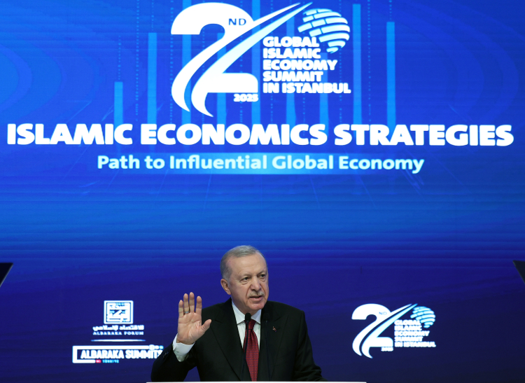 Erdoğan, dünya nüfusunun yüzde 25’ini Müslümanların oluşturduğunu ancak İslami finans sektörünün sadece 2,5 trilyon dolar seviyesinde olduğunu hatırlattı. 57 ülkenin üyesi olduğu İslam İşbirliği Teşkilatı’nın dünya ticaretinden aldığı payın ise yalnızca yüzde 11 olduğunu belirterek, “Nüfus bakımından yüzde 25’e tekabül eden küresel ekonominin yaklaşık yüzde 9’unu teşkil ediyoruz” dedi. Bu durumun İslam aleminin potansiyelinin altında performans sergilediğinin göstergesi olduğunu belirten Erdoğan, aralarındaki ticaret, yatırım ve iş birliğinin artırılması gerektiğini söyledi.