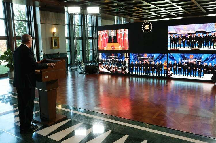 Cumhurbaşkanı Recep Tayyip Erdoğan, Cumhurbaşkanlığı Külliyesi'nde Deprem Konutları Kura ve Anahtar Teslim Törenine canlı bağlantı ile katıldı.