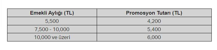 7 bin 500 ila 10 bin lira emekli aylığı alanlara 5 bin 400 lira, 10 bin lira ve üzerinde emekli aylığı alanlara da azami 6 bin lira promosyon ödemesi yapılacak. Bu miktarlar bankaların inisiyatifine bağlı olarak artırılabilecek.