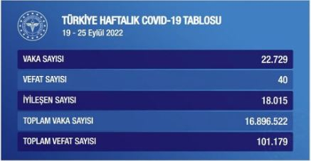 Türkiye'de 19-25 Eylül haftasında 22 bin 729 kişinin corona virüs testi pozitif çıktı, 40 kişi yaşamını yitirdi.