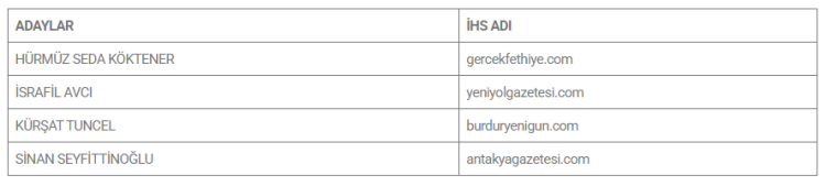 Adayların isimleri ve temsil ettikleri internet haber sitelerinin adları aşağıdaki tabloda yer almaktadır.