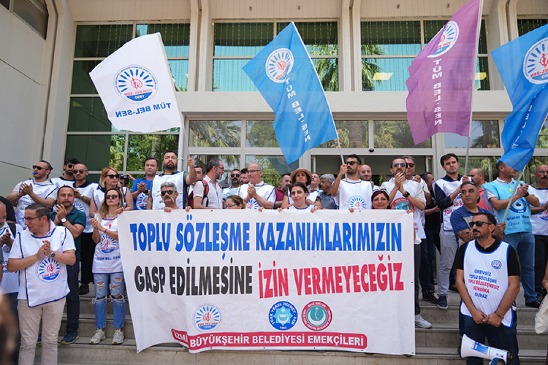 İzmir Büyükşehir Belediyesi ile Tüm Belediye ve Tüm Bel-Sen arasındaki sosyal denge tazminatını içeren toplu iş sözleşmesi görüşmelerinde uzlaşma sağlanamaması üzerine iş bırakma kararı alan memurlar, bugün de eylemlerine devam etti.