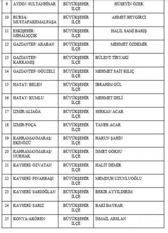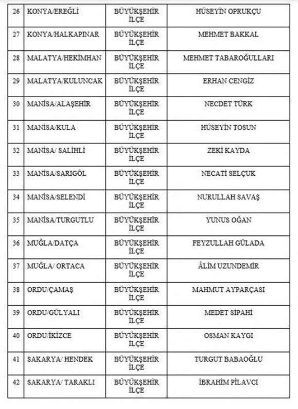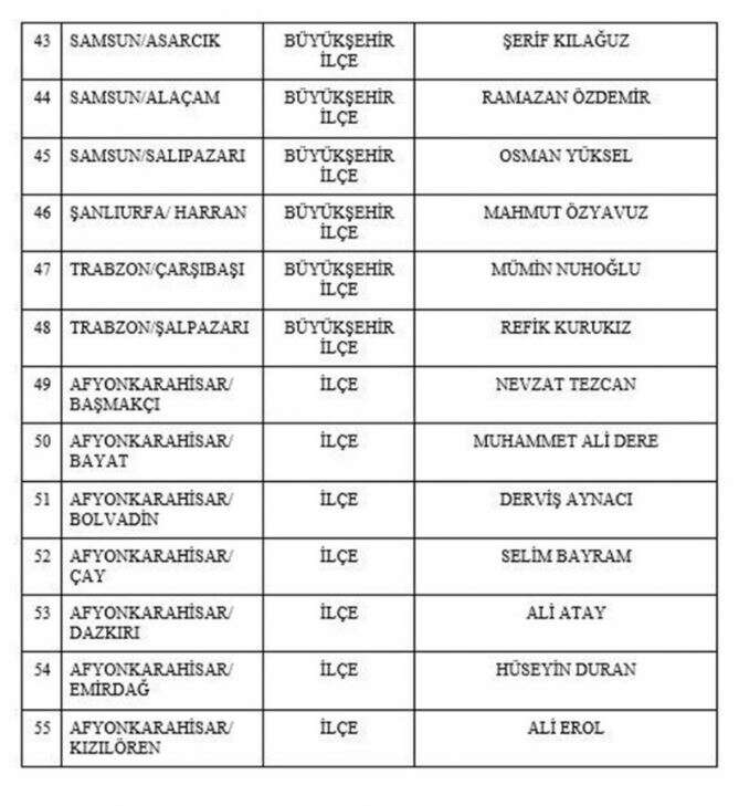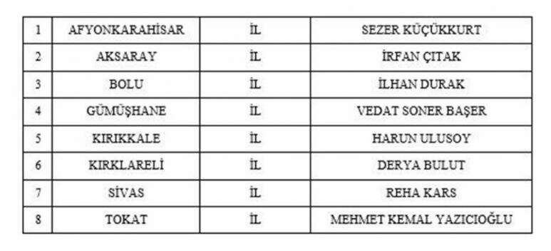 Listeye göre, Afyonkarahisar’da Sezer Küçükkurt, Aksaray’da İrfan Çıtak, Bolu’daİlhan Durak, Gümüşhane’de Vedat Soner Başer, Kırıkkale’de Harun Ulusoy, Kırklareli’nde Derya Bulut, Sivas’ta Reha Kars, Tokat’ta Türkiye'nin "Süper Vali" olarak tanıdığı Recep Yazıcıoğlu'nun oğlu Mehmet Kemal Yazıcıoğlu il başkanlığı için yarışacak.